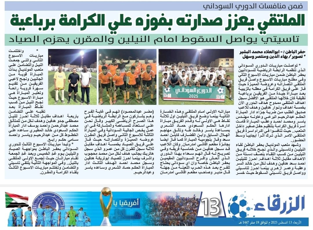 * وفي مطلع مباريات الاسبوع واصل فريق الملتقي انتصاراته وعروضه المميزة حيث فاز علي فريق الكرامة في معقله بالزيبية بعد مباراة جيدة من الفريقين برباعية نظيفة كان خلالها الملتقي هو الافضل.